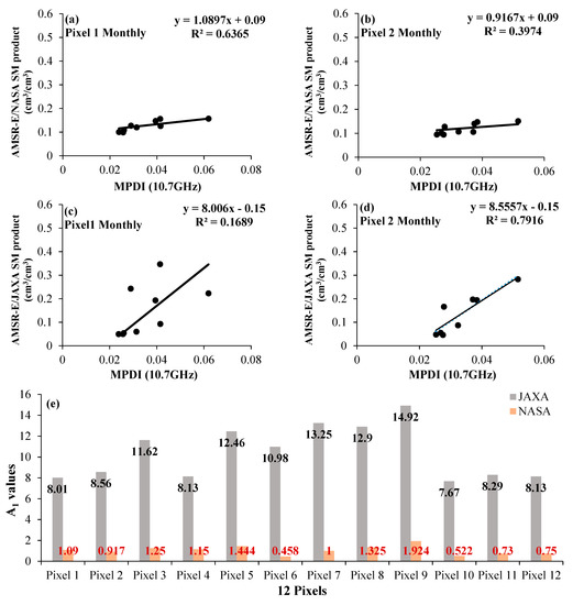 Relationships between the monthly AMSR-E/NASA and JAXA SM values and monthly MPDI in pixels 1 through 12, Naqu area in 2011; (a) NASA SM Pixel 1; (b) NASA SM Pixel 2; (c) JAXA SM Pixel 1; (d) NASA SM Pixel 2; (e) the A1 coefficient values.