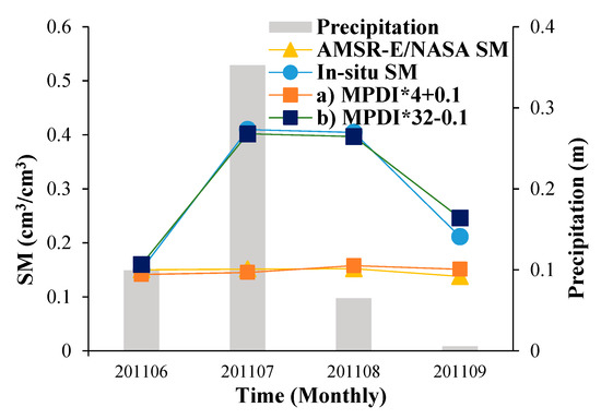 The case (d) SM is closest to the in-situ SM data (Figure 8). In addition, by comparing case (b) with case (d), we found that the calculated SM values were close to in-situ SM measurements from January to June. From July to September, however, the SM values calculated by using case (b) SM = 8*MPDI-0.15 were much lower than the SM values calculated according to case (d) SM = 8*MPDI-0.36. The reason is that the MPDI values calculated with the AMSR-E Level 2A brightness temperature data are much lower than the MPDI values from simulated brightness temperature. The values of the AMSR-E Level 2A brightness temperature data, therefore, may not be accurate from July to September for the Tibetan Plateau. The reason may be that the TOA (top-of-atmosphere) radiance measured by AMSR-E is severely attenuated by vegetation, leading to a small difference between H and V polarization in the summer on the Tibetan Plateau.