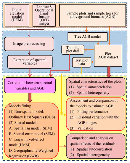 In this study, a non-spatial model, OLS, and four spatial models, including SLM, SEM, LMM, and GWR, were used and compared to improve the AGB estimation of Pinus densata forests.
