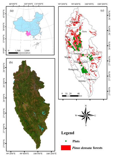 (a) Location of the study area: Shangri-la City. (b) RGB false color composite image from Landsat 8 band 6, band 5, and band 4; (c) Spatial distributions of Pinus densata forests and sample plots.