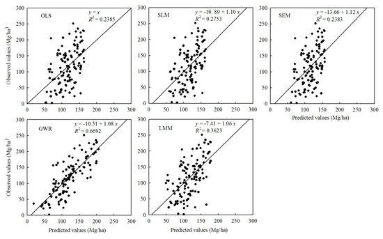In Figure 6, the scatter graphs of the observed and predicted AGB values for the five models are shown to indicate the fitting performance. The GWR had the greatest value of R2, followed by LMM, SLM, OLS, and SEM. The overestimations and underestimations were obviously noticed for OLS, SEM, SLM, and LMM when the observed AGB was smaller than 70 Mg/ha and larger than 150 Mg/ha, respectively, and GWR greatly reduced the overestimations and underestimations by decreasing the interval of AGB values for the overestimations occurring and increasing the threshold greater than which the underestimations started to take place.