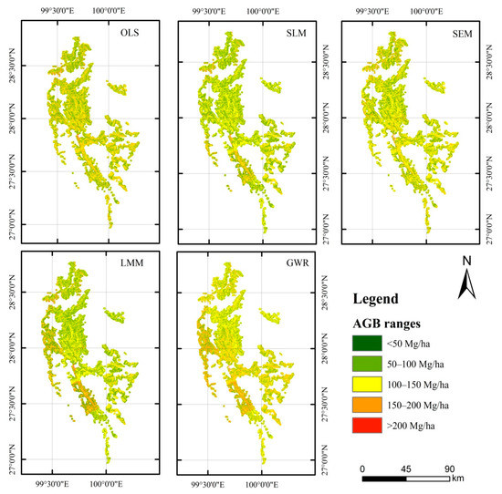 The maps of the predicted AGB values for Shangri-La City were generated using five models in Figure 7. The spatial distributions of the predicted AGB values looked similar to each other. But, by reducing the over- and underestimations, the map by GWR was more heterogeneous than those by OLS, SEM, SLM, and LMM.