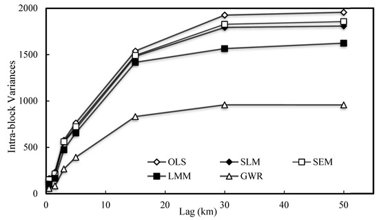 In Figure 5, intra-block variances with different block sizes for AGB were computed to reflect the spatial heterogeneity. The intra-block variances in AGB with lag distances represent the average local spatial variability for a given block size. The variances became larger as the block size increased before the distance of 30 km, then approached a stable level when the block size was relatively large with an approximately lag distance of 100 km.