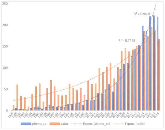 After recovering the data, a first analysis was performed according to the Scopus statistics on the publications retrieved. We analyzed the temporal trend of the number of rs+pheno papers from 1979 to 2018 with respect to the number of all the scientific papers published in the same time interval.
