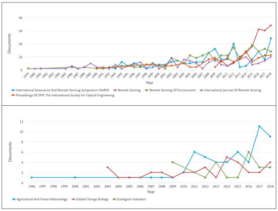 Comprehensively, 117 journals have been used to publish researches about remotely-sensed phenology. Table 1 shows the journals that published more than 20 papers from 1979 to 2018. Among these, the most prestigious journals (impact factor, IF > 5) used in rs+pheno studies were: Global Change Biology (GCB, IF = 8.88), Remote Sensing of Environment (RSE, IF = 8.218), ISPRS-Journal of Photogrammetry and Remote Sensing (ISPRS, IF = 6.942), and IEEE-Transactions on Geoscience and Remote Sensing (IEEE, IF = 5.63); on the contrary, the most cited (H index > 200) were: RSE (H index = 238), GCB (H index = 217), and IEEE-Transactions on Geoscience and Remote Sensing (H index = 216). The most active journals (>100 publications) were: RSE, International Geoscience and Remote Sensing Symposium-IGARSS, Remote Sensing (RS), International Journal of Remote Sensing (IJRS), and Proceedings of SPIE-The International Society for Optical Engineering (SPIE) with, respectively, 232, 166, 150, 148, and 117 papers. It is to be noticed that, among the most publishing, the only journals without remote sensing-like terms in their title were Agricultural and Forest Meteorology (AFM, 57), Global Change Biology (GCB, 30), and Ecological Indicators (EI, 23). According to Figure 2, the journals with the longest history in rs+pheno studies were RSE and IJRS (since 1980), while the most recent was RS (since 2009). However, the latter showed a marked increase in the last three years, twice the other journals. As for the purely ecology-based journals, the first one publishing a paper in rs+pheno was AFM in 1996, followed by GCB in 2003 and EI in 2009; AFM still represents the most active.