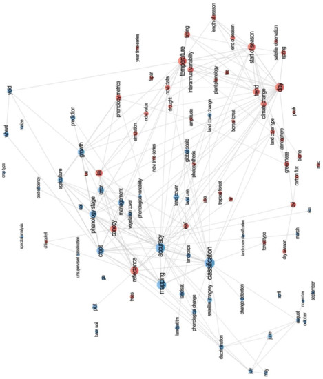 The text data analysis produced the term network maps of Figure 5 and Figure 6, respectively, for the period 1999–2008 (99 terms) and 2009–2018 (383 terms). In the first decade (Figure 5), two groups could be identified, even if quite interspersed. The red cluster was mainly characterized by terms strictly associated to phenology metrics (e.g., greenness, start, end, and length of season), vegetation and canopy indices and their annual profiles (e.g., NDVI time-series, EVI, LAI, fAPAR, amplitude, peak), climate change-related issues (e.g., temperature, trend, interannual variability, drought, fire), and forestry (e.g., canopy, leaf, forest type, tropical forest, boreal forest). The blue cluster was mainly composed of terms related to the classification (i.e., accuracy, mapping, change detection, discrimination, land cover, unsupervised classification), crop modeling (e.g., crops, growth, yield, prediction, cost efficiency, management), and the crop growing season (i.e., months from March to November). It is to be noticed that the only highly cited sensor was Landsat that belongs to the blue cluster.