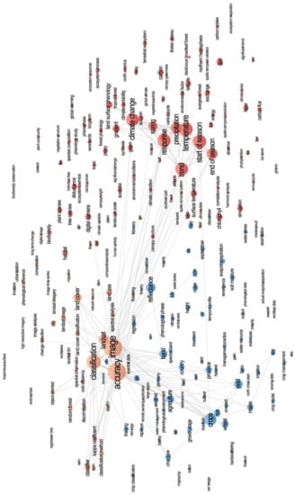 Network mapping and clustering of terms in 2009–2018. Since it is a 3-d map, not all the terms are represented. Lines represent the link strength between two terms (minimum link strength = 10). Red cluster = phenology/climate topic; Blue cluster = agriculture topic; Orange cluster = classification topic.