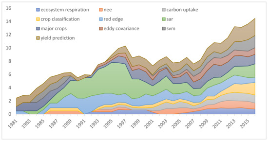Finally, Figure 7 shows the temporal trend of the frequency of the ten most relevant terms identified in 2009–2018 (see Table 3) over the whole study period. The papers, dealing with the selected terms, passed from being 2% to 15% with respect to the total rs+pheno papers. In the early 1980s, only some of the most relevant terms were found, i.e., red edge, major crops, yield prediction. Overall, the majority of the terms were characterized by a gradually growing trend; on the contrary, yield prediction showed a fast increase in the last decade (2009–2018). The terms with the highest frequency were red edge and SAR. The red edge term showed a quite constant trend until the beginning of the last decade when it showed a slight increase. Particularly interesting were the trends of SAR and SVM terms. The former presented a fast growth until its peak around 1995, and then a fast decreasing trend, with a moderate recovery in the last decade. The latter was characterized by an initial interest that ended completely at the end of the 1980s and arose again after the year 2000. It is to be noticed that some terms, like eddy covariance, carbon uptake, and ecosystem respiration, were not taken into consideration until the beginning of the 1990s.