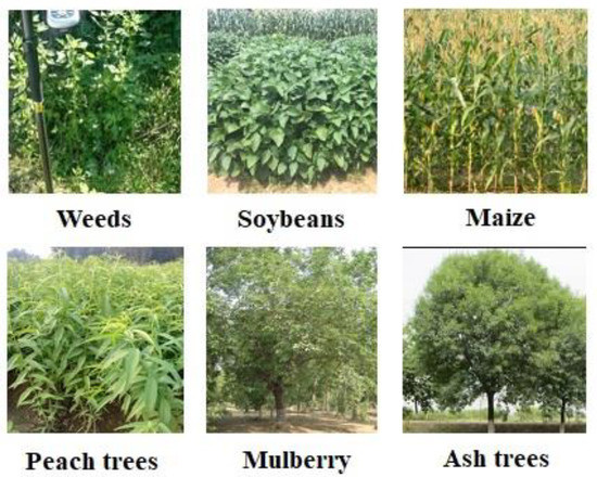 The research area was in the village of Luozhuang, Changziying town, Daxing District, Beijing, as shown in Figure 1. The image was acquired on 24 August 2018. The weather was clear and cloudless. The rich vegetation types included weeds, crops, and tree species, as shown in Figure 2. The crops included soybean in the flowering and pod-bearing stages, and maize in the powder stage. The tree species included mulberry, peach, and ash trees. The vegetation grew densely, and shadows greatly affected the classification results. Therefore, shadows were recognized as a type of object in this paper. In summary, the land species were divided into eight types: weeds, soybeans, maize, mulberries, peach trees, ash trees, dirt roads, and shadows.