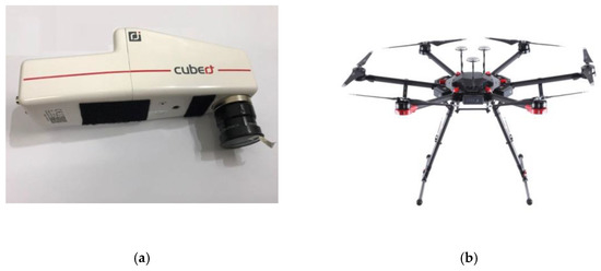 Sensor system and UAV platform: (a) Cubert hyperspectral camera and (b) DJI Jingwei M600 PRO.