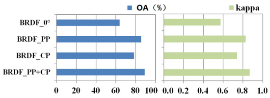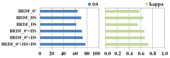 Classification accuracy based on a feature set construction with the BRDF (overall accuracy (OA) and kappa).