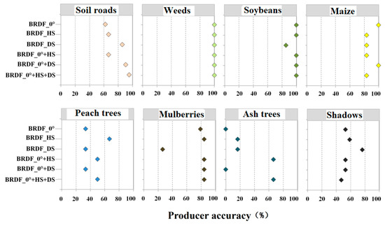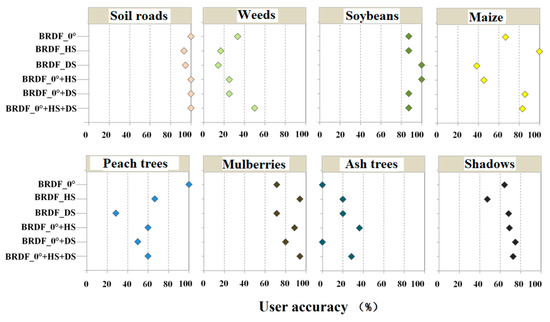 From Figure 9, the combined application of dark spot and hot spot directional reflectance features improved the classification accuracy. The classification results for soybean, peach trees, mulberry trees, and ash trees using BRDF_HS were more accurate than those using BRDF_DS. In contrast, the ground objects with a high accuracy included dirt roads and shadows based on the reflection features in the dark spot direction. The research shows that the tree structure features had a high sensitivity in the hot spot direction.