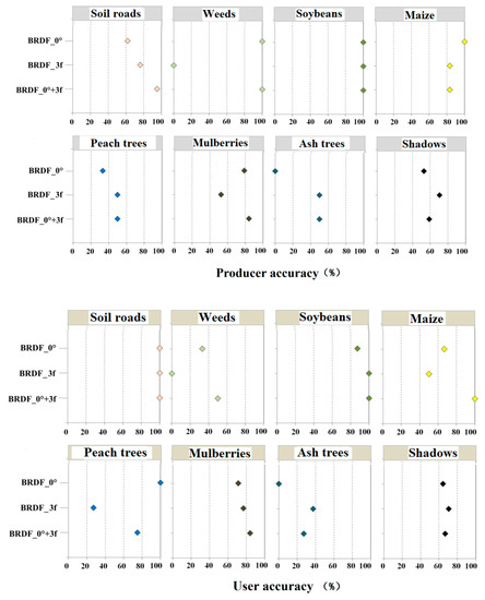 Figure 7 indicates that BRDF_0° was instrumental in the distinction among different objects. The vertical reflectance data of DOM were obtained using statistical methods. However, the method of using a semi-empirical model to construct the BRDF and invert the vertically observed reflectance combines the advantages of an empirical model and a physical model. Although the model parameters are empirical parameters, they have certain physical significance. Consequently, the observation angle of the ground objects is unified with the vertical observations through the BRDF model, which weakens the reflection characteristics of the same type of vegetation affected by the observation angle difference. Compared with the classification results obtained using DOM data, the classification accuracy obtained using BRDF_0° was greatly improved, but the recognition accuracy of dirt roads, peach trees, and ash trees was still very low. The producer’s accuracy of weeds, soybeans, and maize improved to greater than 90%, but the user’s accuracy improved only slightly, which indicates that the results for these three types of land features were overclassified.