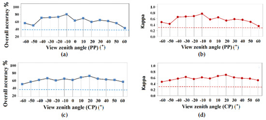 Overall accuracy and kappa coefficient of the vegetation classification based on the multi-angle reflectance characteristics for the observed principal plane and cross-principal plane.