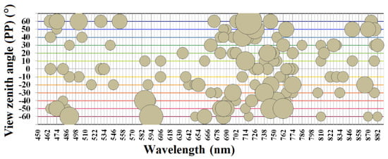 Hyperspectral remote sensing has the advantage of providing hundreds of spectral channels of data to obtain the spectral curves to reflect the attribute differences of the object. It also provides convenience for the study of the band sensitivity of different vegetation types. Figure 15 shows the top 10 bands in terms of feature importance when only the multiband dataset for the observation zenith angle was used for classification in the main observation plane, where the diameter of the circle represents the importance degree of the band. The importance of features were calculated using SPSS Clementine software, and the indicators included the sensitivity and information gain contribution. The results show that in the main plane of observation, the blue band (466–492 nm), green band (494–570 nm), red band (642–690 nm), red edge band (694–774 nm), and near-infrared band (810–882 nm) were of high importance, among which the blue light band, red light band, and red edge band were the most important.