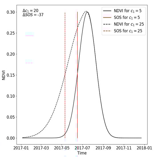 Plot demonstrating how a change in the parameter of Equation (2) results in a corresponding change in SOS. Here, the SOS has been moved forward by 37 days by changing the parameter from 5 to 25.