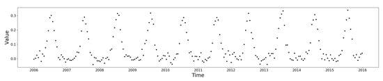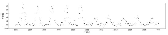 The method used to generate the simulated NDVI time series was based on that described by Verbesselt et al. [15,24]. We chose to simulate NDVI because most of the methods are designed to work on a single band or index. Furthermore, NDVI is a well-recognised and widely used metric for examining trends in vegetated areas. The method involves using a double Gaussian function to simulate an NDVI signal over time, where …, for a time series with n observations per year. For each year in the time series, the NDVI value at time t is defined by the amplitude of the seasonal curve (a) (i.e., the peak NDVI value), the base or lowest winter value, the location in time of the maximum value for each year b, the width of left left hand side of the curve (), and the width of right hand side of curve () (Equation (2)). Based on work by Verbesselt et al. [15], we used a value of to simulate 10-year time series at a 16-day temporal resolution giving approximately 23 observations per year and centering the curve around the middle of the year. The trend component is a small NDVI value which is added or subtracted cumulatively from each value, to create an upward or downward trajectory. The noise component was added randomly to create more realistic variation in the time series, as explained in Section 2.3.