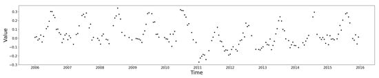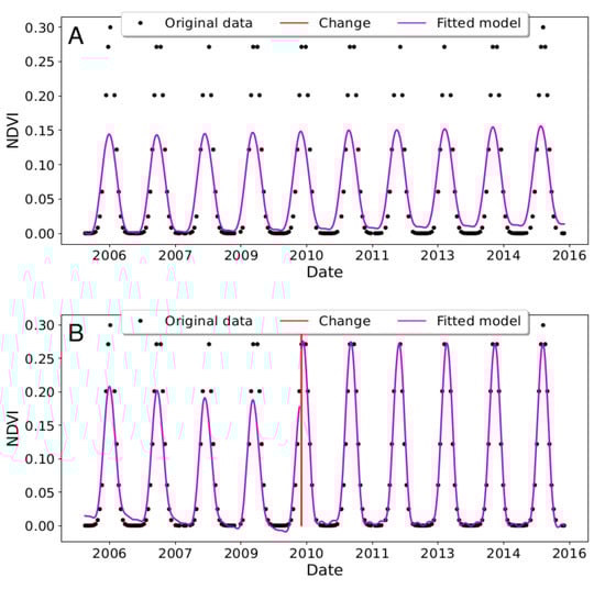BFAST Monitor was developed as a near-real time alternative to BFAST [24]. Similar to BFAST, it has mainly been applied to forest monitoring [25,26,27]. It is based on the premise that change can be identified by looking for deviation of new observations from a stable history period. Unlike BFAST, BFAST Monitor does not attempt to separate seasonal and trend changes. The season-trend model given by Equation (1) is fitted to the stable history period using OLS. Here, represents the data at time t, is the intercept, is the slope, k is the number of harmonic terms, …, represent the amplitudes, …, represent the phases, f represents the number of observations per year, and is the error. When new observations are available, residual values are calculated using the fitted model and Moving Sums (MOSUMs) of the residuals are used to look for instability which would indicate structural change [24]. This allows BFAST Monitor to flag a change within a single observation.