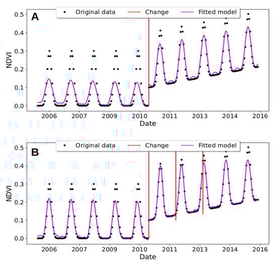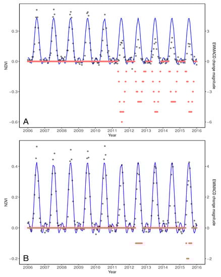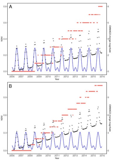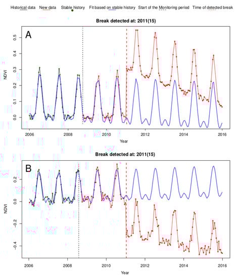 - The detection of seasonal changes is a field in itself and software packages such as TIMESAT [42,43] can aid in more detailed reconstruction of seasonal curves. However, of the methods investigated here, we found both EWMACD and BFAST Monitor capable of detecting at least high magnitude seasonal change, such as a change in the number of seasonal peaks present (indicating a change in cropping practices) or a substantial increase in seasonal amplitude (indicating, e.g., a change in yield). Of the two, we would recommend EWMACD due to its lower likelihood of detecting false change.