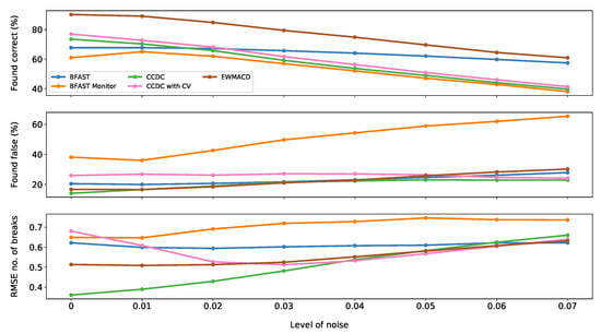 All methods reported a significant negative correlation between percentage of correct results found (across all simulations) and noise level (, < −0.9). The decrease in percentage of correct results found between the lowest and highest noise levels was approximately 20% less for BFAST than for any other method (Figure 6), suggesting more consistent performance across noise levels in this metric than the other methods.