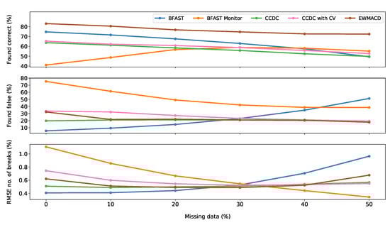 Breaking down the results by percentage of missing data revealed contrasting trends for BFAST and BFAST Monitor. For BFAST, significant () positive correlations () were found between level of missing data and percentage of simulations where at least one false break was found and between missing data level and RMSE number of breaks. However, this was reversed for BFAST Monitor, where significant negative trends (, ) were found for both metrics. A significant negative correlation (, ) was also found for BFAST between missing data level and percentage of simulations where the correct break was found, whereas no significant trend was found for BFAST Monitor. Figure 7 shows an increasing trend for BFAST Monitor in terms of correct breaks found up to the 30% level, and then a slight decreasing trend. Overall, the results show that BFAST becomes less effective at break detection with more missing data, while BFAST Monitor becomes more effective.