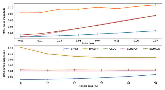 No significant correlation was found between noise level and RMSE number of breaks for BFAST or CCDC with CV. Figure 6 indicates that while BFAST did not have the lowest RMSE values, it remained very consistent across noise levels. While a significant positive relationship was reported for EWMACD (, ), it was also relatively consistent across noise levels for RMSE.