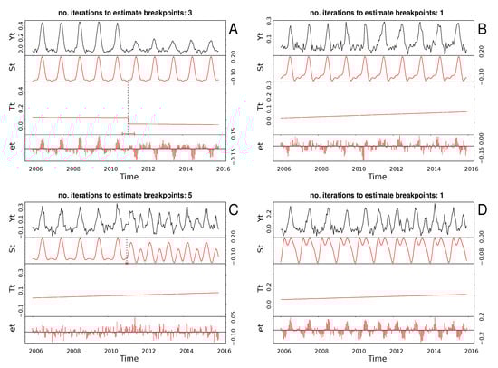 BFAST requires two user-defined parameters: (1) the minimum distance between breaks; and (2) the maximum number of iterations. Saxena et al. [11] suggested that the number of breakpoints is the most influential parameter—if the number of breaks exceeds the number of breaks defined by the user, then it will only find the strongest. The minimum distance between breaks was set to two years (46 observations), which is in line with the guidelines given by Verbesselt et al. [15] and matches the two-training period we used for the other methods. BFAST requires that time series have no gaps so linear interpolation was used for simulations with missing data.