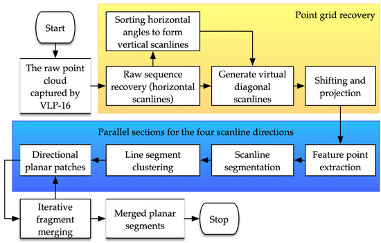 The proposed plane extraction method based on the ELS algorithm is presented in this section with detailed steps. The initial procedure is the recovery of the original point grid, which is the virtual point cloud sequence in grid form, from the point clouds captured by the multi-line 3D MLS. Then, feature points are extracted using the line simplification algorithm concerning the scanline directions. Subsequently, the scanline segments are generated and clustered to form planar segments regarding the given scanline directions. Finally, planar patches of different groups are merged iteratively to form planes. Because the algorithm is designed to deal with the inhomogeneous point clouds, the data captured by the Velodyne VLP-16 are used to demonstrate the implementation of the proposed method to multi-line MLS point clouds. The general flowchart of the proposed method is shown in Figure 1.