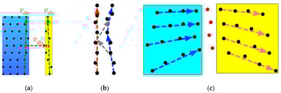 The segment clustering process with the introduction of the displacement vector: (a) the process of checking if the pending scanline segment (in the yellow box) can be clustered into the planar region (in the blue box). The two direction vectors () were checked and then the displacement vector () generated by connecting the two centroids (red points) of the neighboring segments; (b) the segments of a curved scanline (the blue dashed arrows) clustered into the same plane by using the shared neighbor (the red dashed arrow) with the procedure shown in gray dashed arrows; (c) the over-fragmentation problem caused when a group of feature points in red separate the plane into two segments (cyan and yellow).