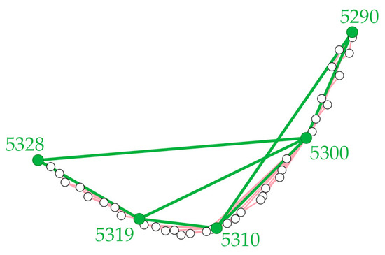 The routes of transferring the rotation and translation with redundant observations. With the frame ID beside, the dots in green represent the positions of the keyframes, and those in white indicate other regular frames. The multi-path problem exists in estimating the initial relationship between keyframes. The observations between normal frames are drawn in red while the observations between keyframes are in green. In addition to the tedious paths through adjacent frames, the available paths from 5290 to 5328 include 5290 → 5300 → 5328, 5290 → 5300 → 5319 → 5328, 5290 → 5300 → 5310 → 5319 → 5328, and 5290 → 5310 → 5319 → 5328. The one with the fewest edges is 5290 → 5300 → 5328.