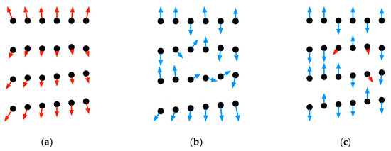 The normal estimation using the tools provided by PCL [86] showing the correct and wrong estimation of local normals. The blue and red arrows starting at the position of the points, represented by black dots, show the direction of the estimated normals. The red arrows demonstrate correct estimations while the blue ones are wrong. (a) The correct normal estimations of points on a wall with a searching radius that is larger than the distance between scanlines; (b) With a smaller searching radius, the wrong estimations in blue are affected by whether points on the neighboring scanline are within the search radius; (c) Similar results produced as in (b) while the criterion for determining the local vicinity is kNN.