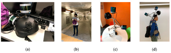 The plane-to-plane alignment workflow was applied to a dedicated mobile mapping solution, Seamless Spatial Data Acquisition System (S2DAS), developed. It consists of two multi-line Velodyne VLP-16 scanners, as shown in Figure 9. The distance between the scanners could be adjusted to fit the installation frames, and either a helmet or a backpack can be used as the installation platform. The angles between the two scanners are nearly 76°, making one of the scanners capturing point clouds of the surrounding environments horizontally while the other concentrates on capturing points bounced by the ceilings and floors. Therefore, planes facing multiple directions are extracted from point clouds captured by both the scanners. The alignment process facilitates the multiple facing directions of the extracted planes to determine the 6DoF movements between frames.