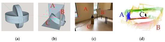 The leverarms between the two scanners are estimated using the common planes extracted from the two point clouds. In the calibration site, perpendicular planes are set in the overlapped Field-of-View (FOV) of the two scanners, as shown in Figure 10. Once the synchronization of the two scanners is achieved using a dedicated device that keeps simulating GNSS signals in indoor environments, the rotation and translation matrix between the two point clouds is estimated by manually aligning the planes extracted using the ELS algorithm.
