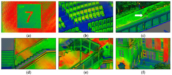 In addition, verification experiments were conducted in complicated environments, including a lecture theater, a three-floor stairwell, and an outdoor terrace, as shown in Table 4. Details of the S2DAS point clouds are captured (Figure 12), showing that object shapes can be recovered correctly using the proposed IMU-free workflow.