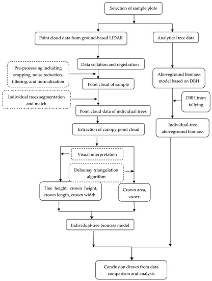 A flow chart of techniques used in the research is shown in Figure 2. This chart summarizes the steps for estimating forest AGB using TLS data. The main steps were the extraction of crown parameters and the fitting of the forest AGB model.