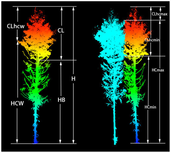 Schematic diagrams of crown parameters. Height of the first living branch (HB), the height at the maximum crown width (HCW), the minimum contact height of the crown (HCmin), the maximum contact height of the crown (HCmax), tree height (H), and differences between H and various heights extracted from the point cloud, which give crown length (CL), crown length from the crown at maximum width (CLhcw), crown length from minimum contact height (CLhcmin), and crown length from maximum contact height (CLhcmax).