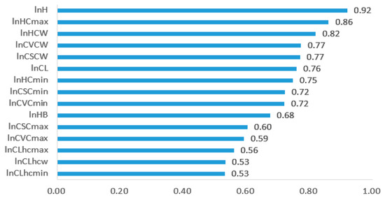 To study the relationships between 15 LiDAR-extracted crown parameters and biomass, correlations between the biomass calculated by Equation (1) and each log-transformed LiDAR-extracted crown parameter were analyzed. Correlation coefficients of 15 crown parameters and biomass are given in Figure 4. The r values of all crown parameters were greater than 0.5, indicating that all 15 crown parameters were strongly correlated with biomass. Among the crown height parameters, lnH exhibited the strongest correlation with biomass (r = 0.92), followed by lnHCmax (r = 0.86), lnHCW (r = 0.82), lnHCmin (r = 0.75), and lnHB (r = 0.68). Among the crown surface area parameters, lnCSCW exhibited the strongest correlation with biomass (r = 0.77), followed by lnCSCmin (r = 0.72) and lnCSCmax (r = 0.60). Among crown volume parameters, lnCVCW exhibited the strongest correlation with biomass (r = 0.77), followed by lnCVCmin (r = 0.72) and lnCVCmax (r = 0.59). Among the CL parameters, CL exhibited the strongest correlation with biomass (r = 0.76), followed by CLhcmax (r = 0.56), CLhcw (r = 0.53), and CLhcmin (r = 0.53).