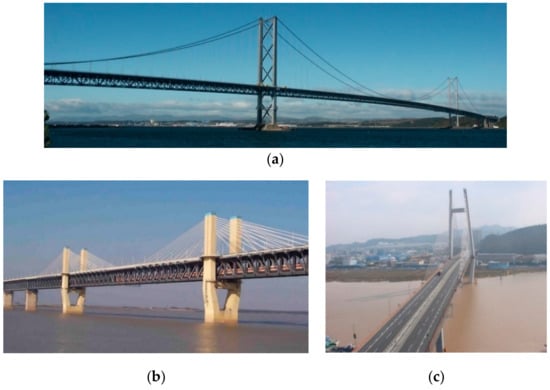 (a) The Forth Road Bridge (Edinburgh, UK) (Stuart Halliday/CC-BY-3.0), (b) the Wuhu Yangtze Bridge (Wuhu, China) (Glabb/CC-BY-SA-3.0), and (c) the Ningbo Zhaobaosang Bridge (Ningbo, China).