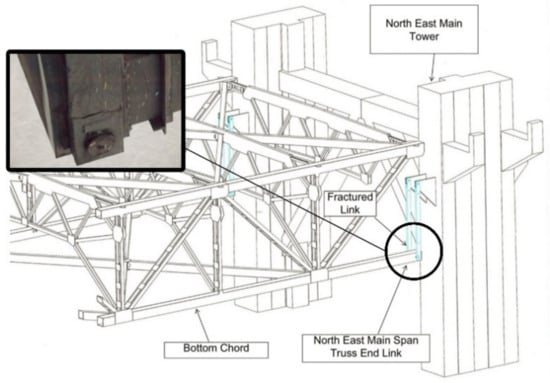 The main span and two side spans were connected to the main towers by pairs of truss end links, which were among the critical elements of the FRB. In December 2015, a fracture on one of the North East truss end links connecting the main span to the North tower was detected (Figure 2). This was followed by further inspection and an approximately one-month closure of the bridge to carry out a temporary fix. Later, in February 2016, the FRB was re-opened to all traffic. A plan to prevent similar failures in the future was developed and was implemented in March 2017. Currently, all the truss end links of the main span have been replaced by truss end bearings.