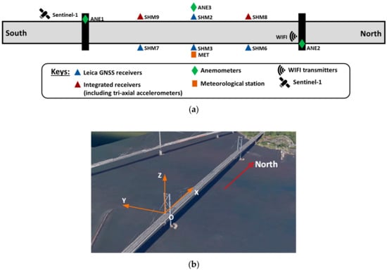 Motivated by the potential and challenges of GNSS for real-time monitoring of long-span bridges, the project “GNSS and Earth Observation for Structural Health Monitoring of Long-span Bridges” or GeoSHM was launched with the support of the European Space Agency in 2013. Led by the University of Nottingham, the Feasibility Study (FS) was conducted from August 2013 to March 2015 with a small sensor system featuring GNSS and state-of-the-art Earth Observation (EO) technologies used to monitor the Forth Road Bridge (FRB) in Scotland (Figure 1a). Outcomes of this study confirmed it is economically and technically viable to use GNSS and EO to monitor the performance of the FRB.