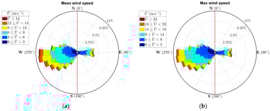 The wind roses in Figure 5 represent the distribution of the 10-min mean and maximum wind speed against the wind direction measured at the FRB. Thanks to its geographical location and the surrounding topography of the Firth of Forth, the FRB primarily experiences the wind between the South-West and West directions with the maximum gust speed of more than 23 ms−1. Similar wind strength is also found coming from the East but is much less frequent and less dispersed. Northerly winds are very rare and have much lower strength. Figure 5 also indicates the dominance of the low wind speed for the FRB where wind records with 10-min mean speeds less than 10 ms−1 are account for nearly 90% of all data.