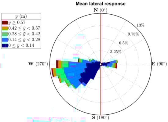 Wind rose of the mean lateral response. The x-axis of the bridge is aligned with the red line.