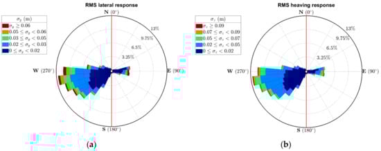 Wind roses of (a) the RMS lateral response and (b) the RMS heaving response. The x-axis of the bridge is aligned with the red lines.