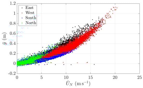 Examining the variation of the lateral displacement at the mid-span against the normal component of the mean wind speed (Figure 13) clearly shows the quadratic trends for all response quantities indicated by the red dashed line as predicted by the quasi-steady theory []. As highlighted by the red circles, the mean lateral displacement at the mid-span caused by the peak gust of Storm Ali agrees well with the quasi-steady analysis while the RMS and maximum displacements slightly deviate from the trend-lines.