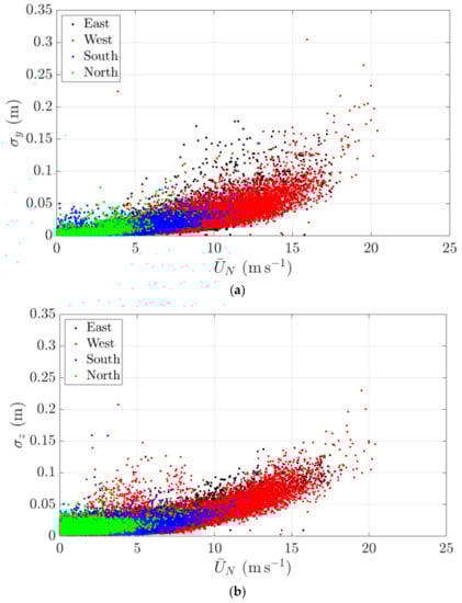 Variability of (a) the RMS lateral response and (b) the RMS heaving response against the normal component of the 10-min mean wind speed.