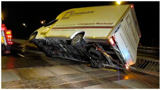 With a recorded gust speed of approximately 120 mph, Storm Elon is one of the biggest windstorms that have affected Western and Northern Europe. Just after midnight of 09 January 2015, Storm Elon made an impact on the FRB. Analysing limited wind data provided by the bridge authority showed that the maximum gust significantly increased during a 90-second period and reached the speed of 40.7 ms−1 (91 mph). The increase in the wind speed over such a short duration was similar to a step excitation on the bridge. As a result of the excitation, the non-stationary response was observed on the FRB. The mid-span was found to drift laterally to the East by 2 m, which was followed by a dynamic response at the first lateral vibration mode with the maximum peak-to-peak amplitude of 3 m. Further analysis of rainfall radar images revealed that the rapid increase in the wind speed was caused by a gust front of sustained strong winds associated with squall lines travelling across the FRB. A detailed discussion of this windstorm can be found in Reference []. During the storm, it was reported that a van has been blown over by a large gust of wind while crossing the bridge at 00:36, which coincided with the increase in the wind speed and bridge response (Figure 10). Incidents where vehicles were blown over on the FRB were reported on at least two other occasions, which include the dates of 11 January 2017 and 14 March 2017. These events show the vulnerability of the FRB to wind hazards and the risk to road users.