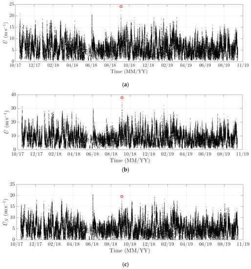 (a) The 10-min mean wind speed, (b) the maximum 0.2-second gust wind speed, and (c) the normal component of the mean wind speed in the duration from 15/10/2017 to 15/10/2019. Storm Ali is highlighted by the red circle.