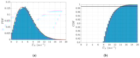 (a) The full and (b) close-up view of the cumulative distribution of the normal component of the 10-min mean wind speed, compared against the fitted Weibull distribution (the distribution parameters are A = 6.280, B = 1.838). The black line indicates the 99% percentile value of 14.4 ms−1.