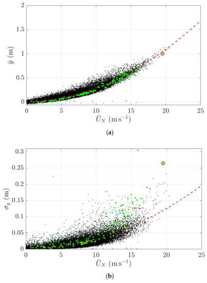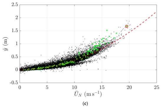 Variation of (a) the mean, (b) RMS, and (c) maximum lateral displacement against the normal component of the 10-min mean wind speed. The data points on 19 September 2018 are shown in green while the ones associated with the peak wind speeds due to Storm Ali are highlighted by the red circles.