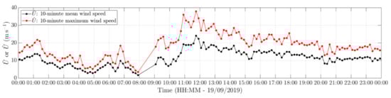 24-h variation of the 10-min mean and maximum wind speed on 19 September 2018. Data points are joined for better clarification.